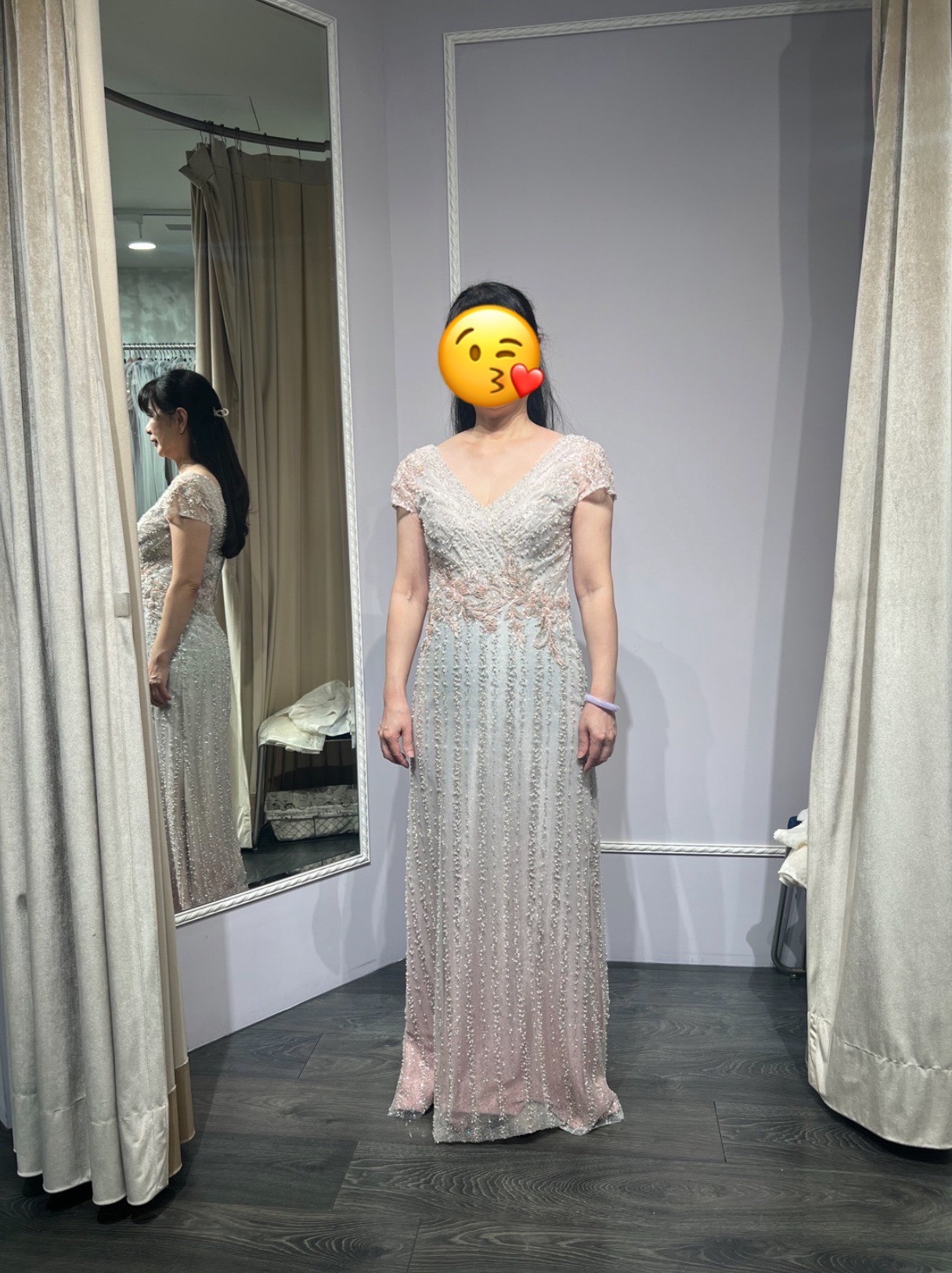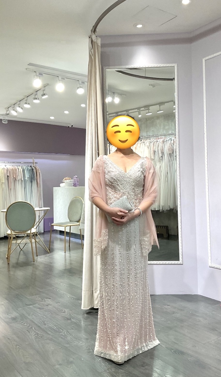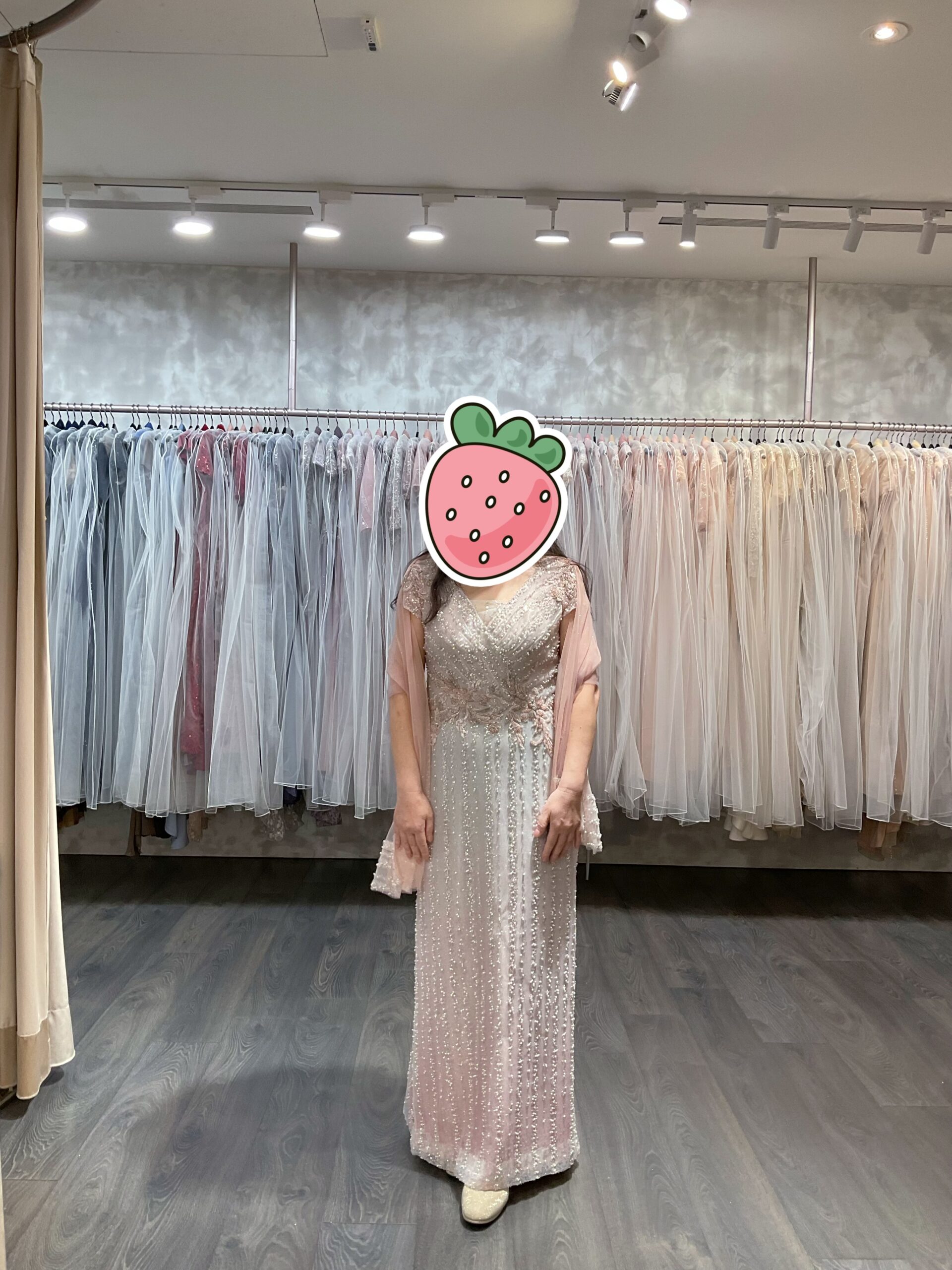 試穿了許多件,最後選定這件珠光粉色禮服。雖然是布滿亮片的款式,但內襯材質非常舒適,完全不會有刮膚感。剪裁非常修飾身材,穿起來很顯瘦。最棒的是這件禮服的顏色非常高級,搭配同色系的蕾絲披肩,更添了一份溫柔的氣質。從細節到整體質感都無可挑剔,讓我能自信且優雅地出席重要場合!