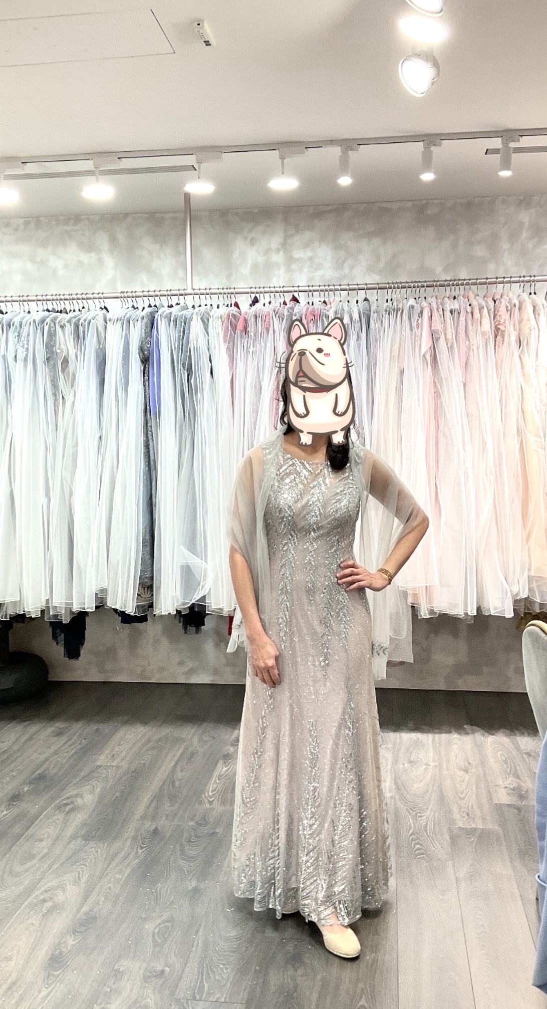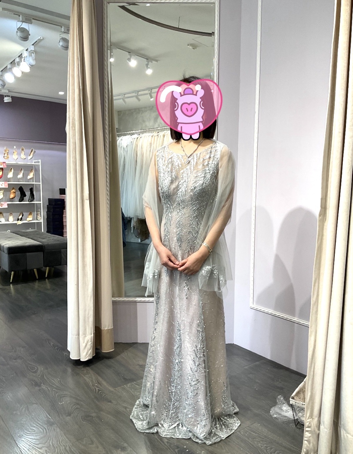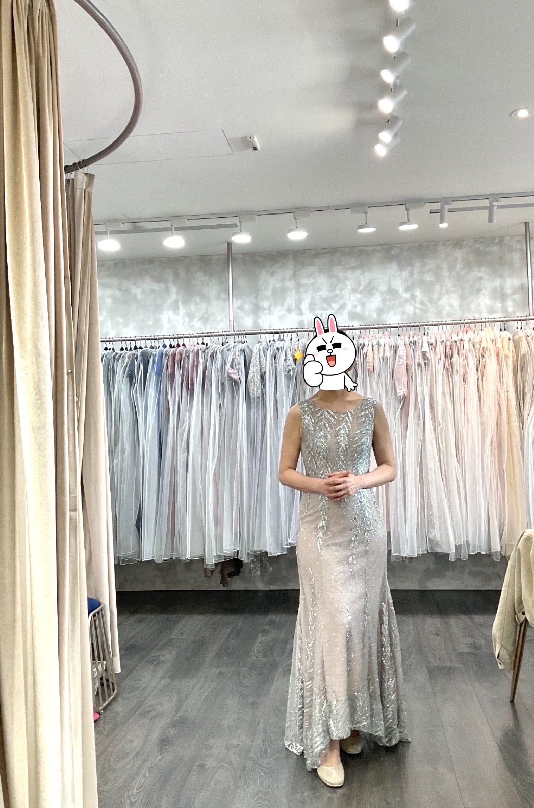 找了好多家才在魅麗選到這件粉底銀亮片款。這件衣服的設計很特別,魚尾剪裁修身又大氣,在燈光下非常有光澤感。在那樣充滿愛與淚水的感人儀式中,這套衣服讓我能以最得體的形象出席,留下了很多精緻的影像紀錄。真的很滿意。💖