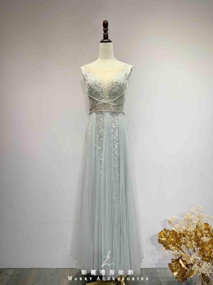 這款 水藍灰亮片交叉細鑽條狀薄紗禮服,以夢幻冷調的水藍灰色為主體,搭配 亮片與交叉細鑽設計,並在裙擺以 條狀薄紗裝飾 增添流動感與層次。