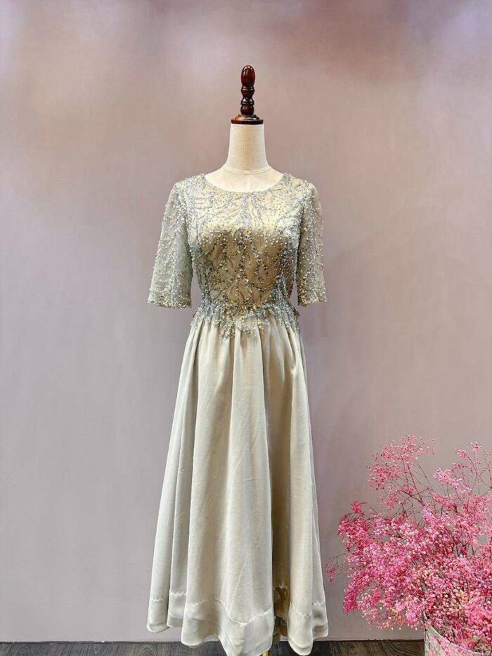這款灰色半袖蕾絲紗裙禮服是一種極具優雅和迷人魅力的特殊場合服裝。