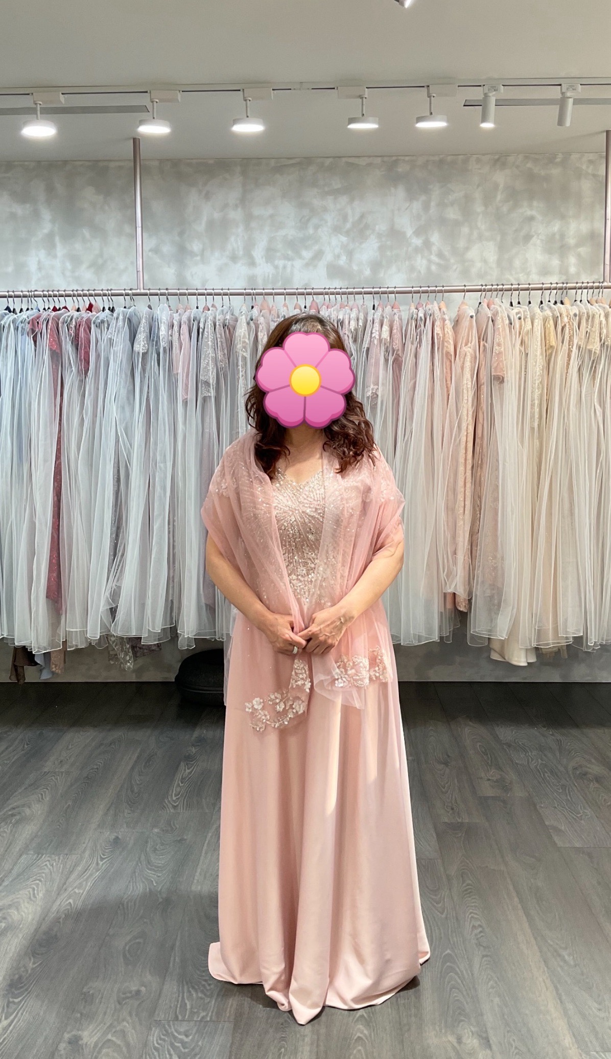 這件禮服的緞面光澤很高級,粉色蕾絲手工也很細膩,穿上去氣色變得非常好。魅麗的服務真的親切又專業😊