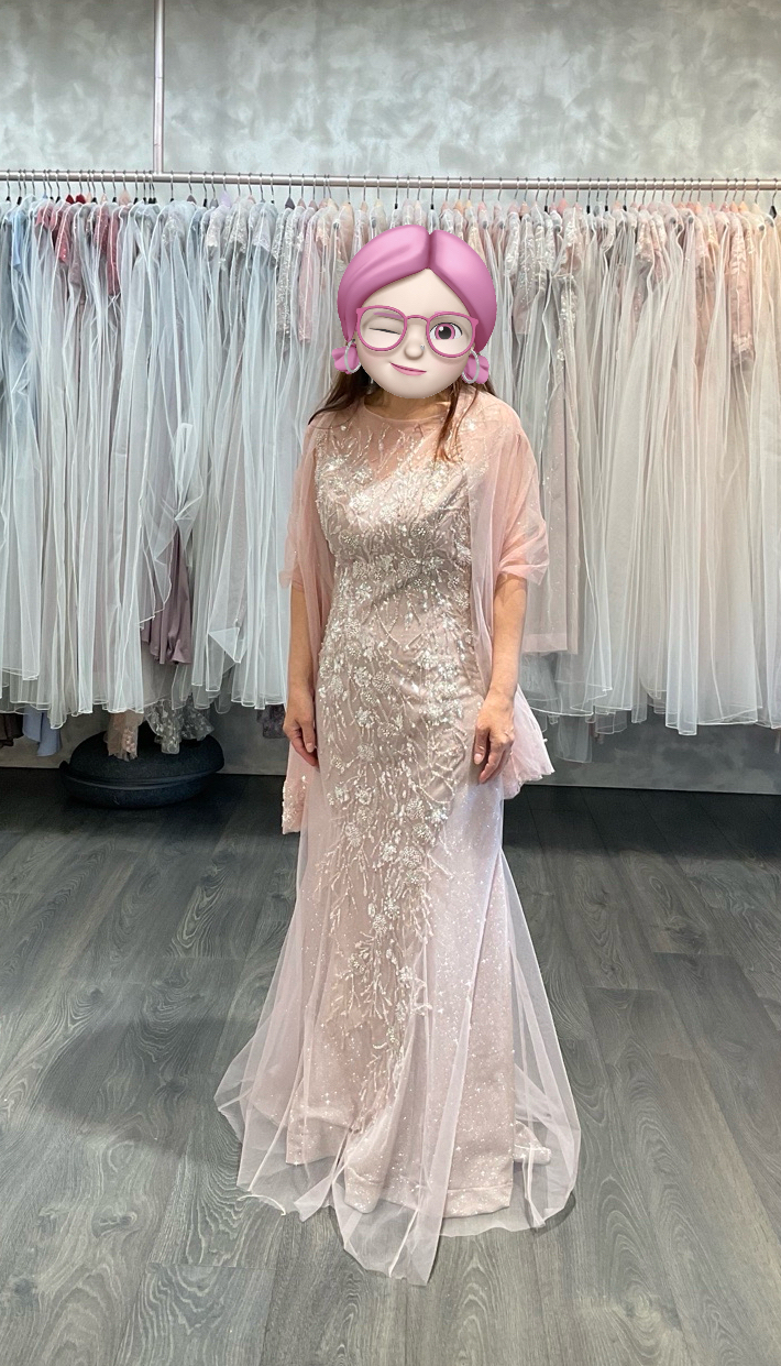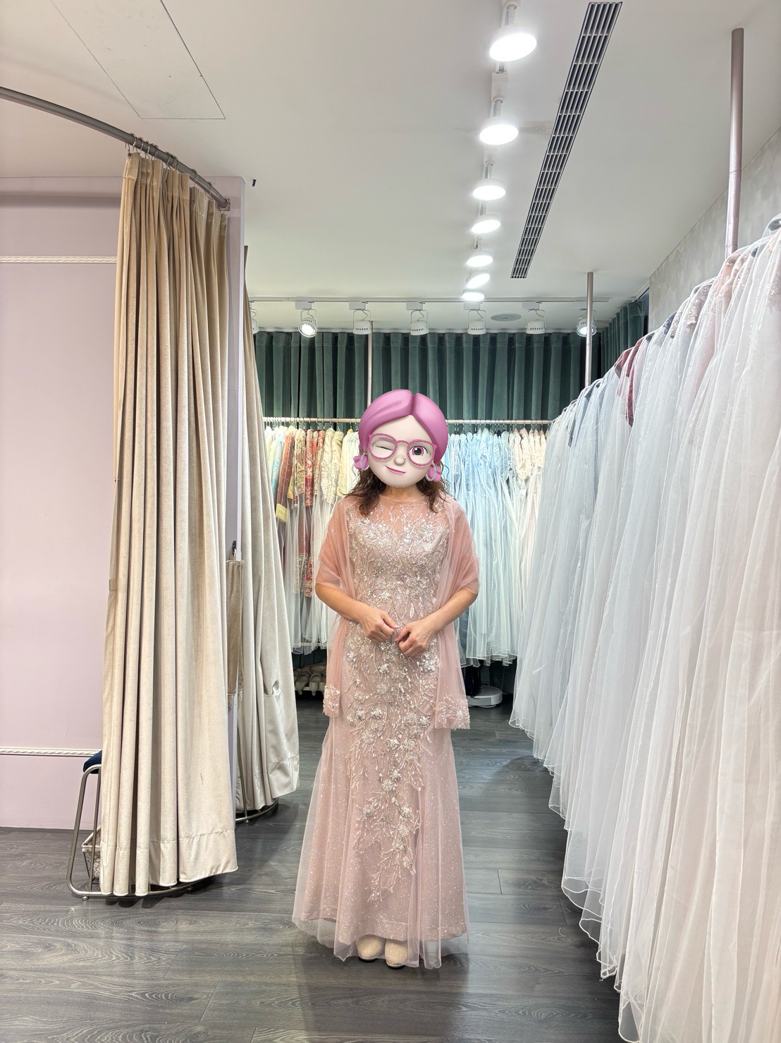 這款 玫瑰粉珠花亮片藤蔓蕾絲紗裙魚尾禮服,以柔和甜潤的玫瑰粉色作為基底,結合手工珠花、亮片與藤蔓刺繡工藝,營造出細膩柔美的視覺層次。