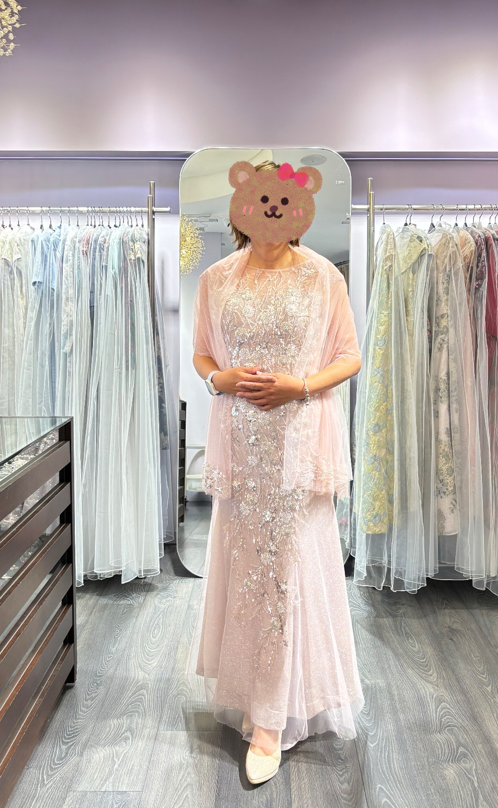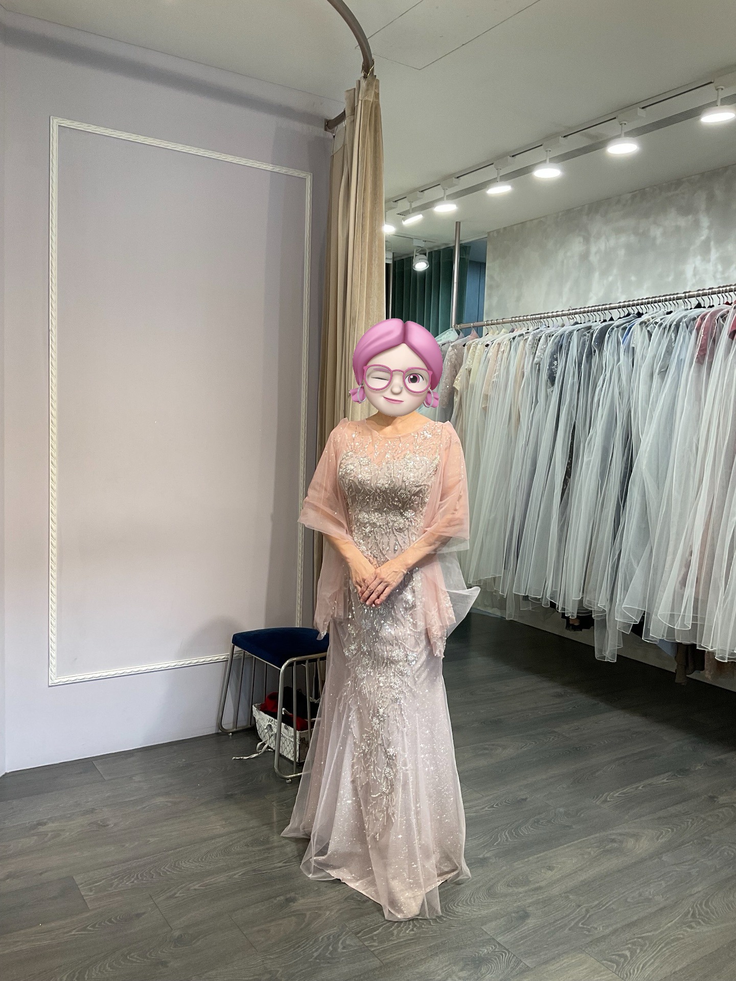 禮服裙身以 柔霧紗材質為主體,內層搭配同色系蕾絲,採用 微魚尾裙型設計,自膝線以下自然展開,修飾臀部與腿部比例。