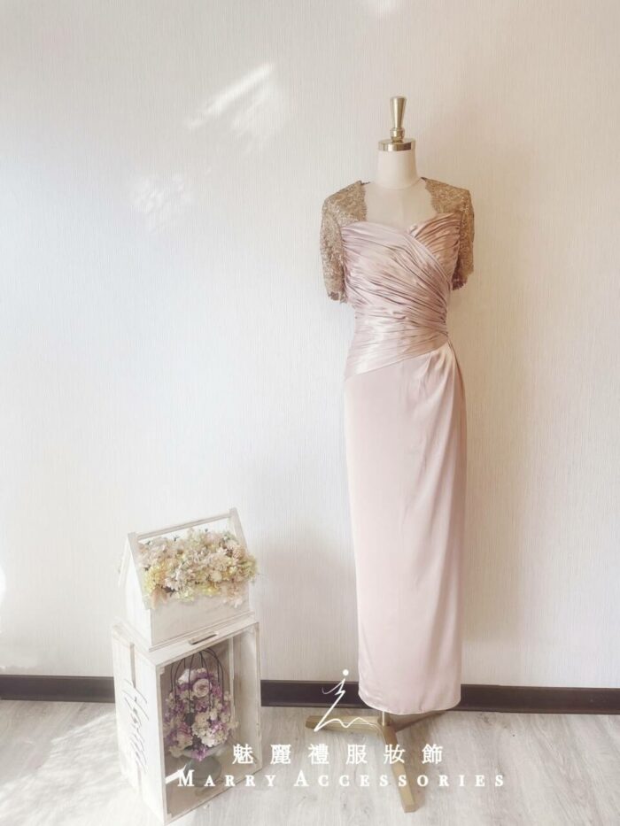 粉膚色緞料包肩袖晚宴媽媽禮服