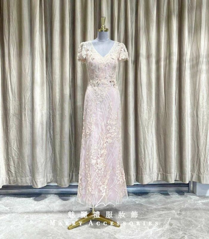 這款「粉色V領繡花流線媽媽禮服」將粉色的柔美和V領的性感完美結合,展現了女性的優雅風采。