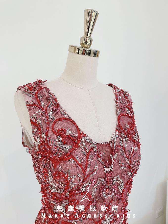 這款紅絲線細鑽亮片蕾絲禮服展現了極致的奢華和優雅。