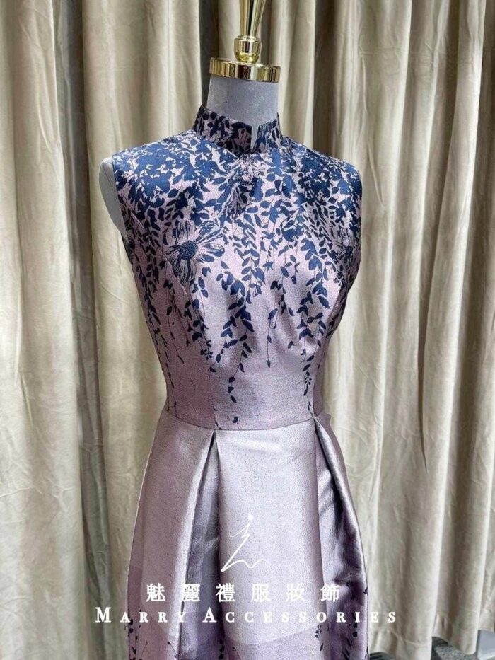 「紫色高領復古花紋A字媽媽禮服」是一款散發復古風情的優雅禮服。