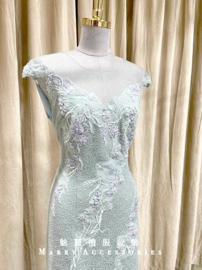 禮服以清新的綠色為主調,散發出一股清新自然的氛圍,讓整體造型更加輕盈宜人。