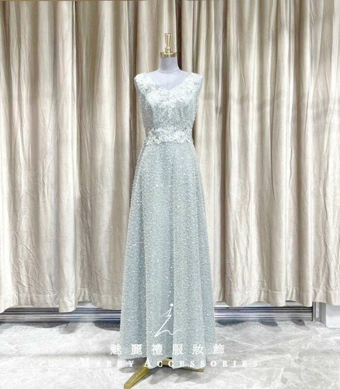 珍珠是這套禮服的一大亮點,可能以點綴在領口、袖口,或者是禮服的其他位置,為整體造型增添了高雅的氛圍。
