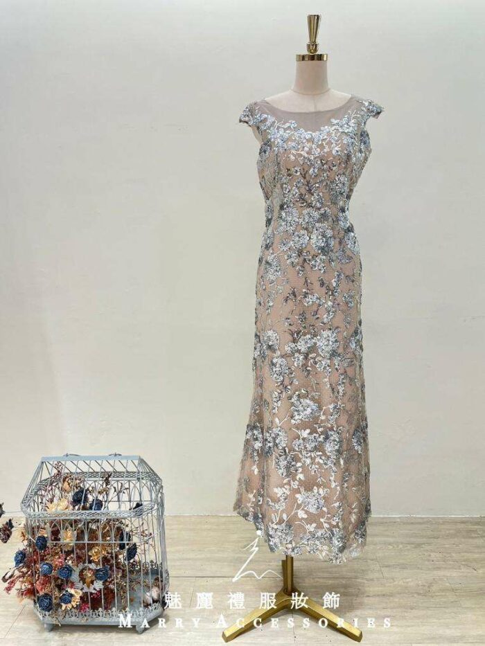 這款膚底銀花亮片包袖禮服展現了高貴優雅的氣質。