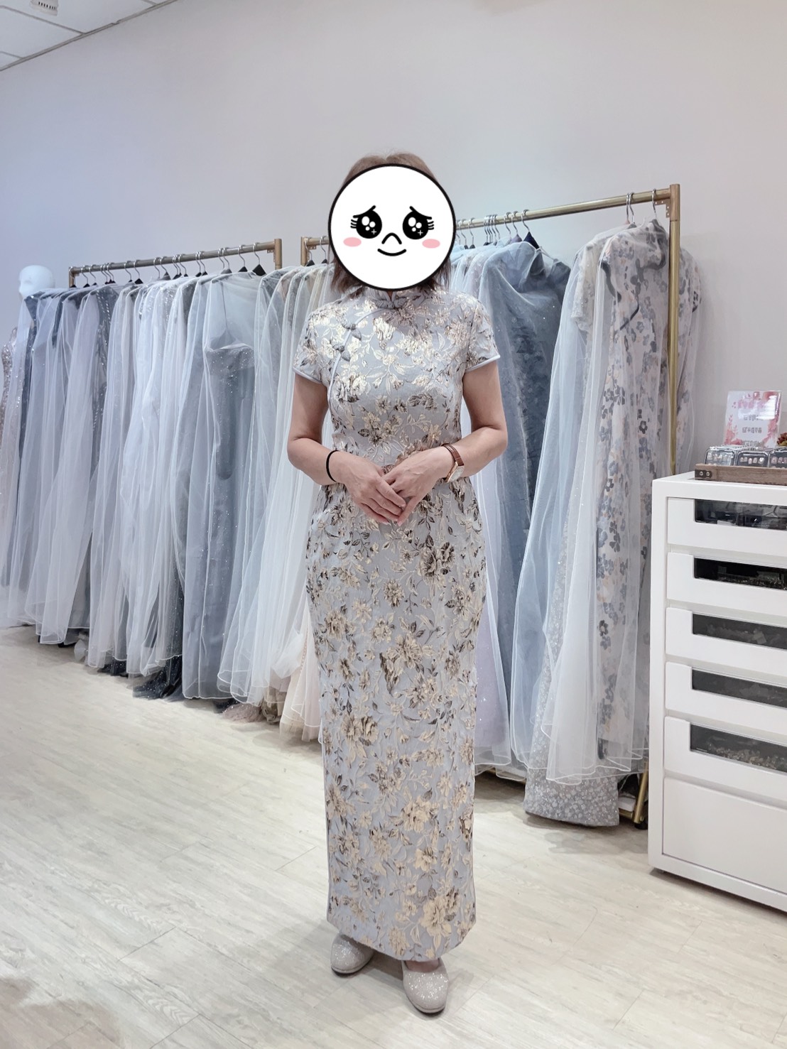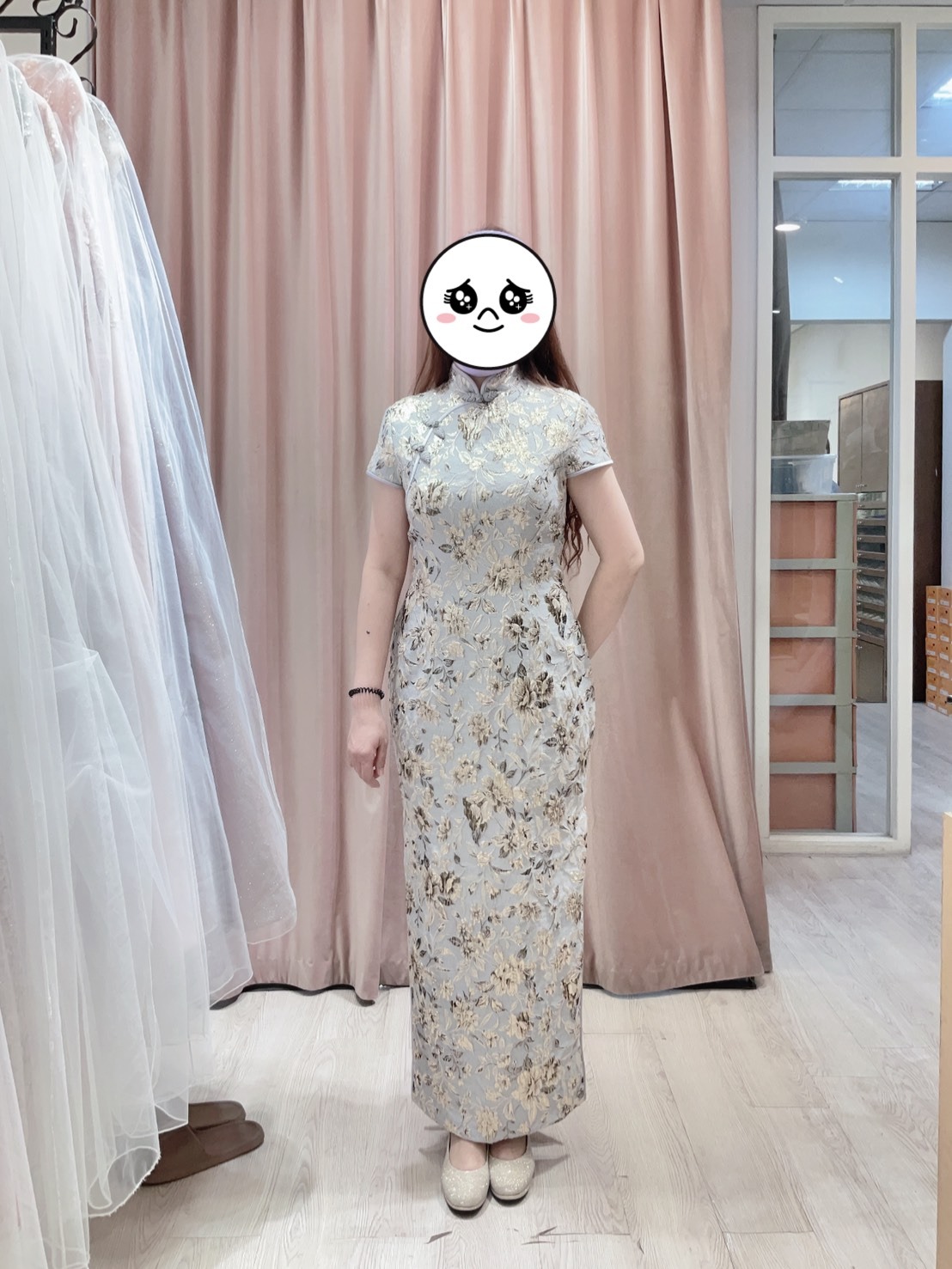 這款 莫蘭迪灰立體金花刺繡旗袍,將沉穩內斂的莫蘭迪色系與中式優雅的旗袍輪廓完美融合,搭配細膩奢華的 立體金花刺繡。
