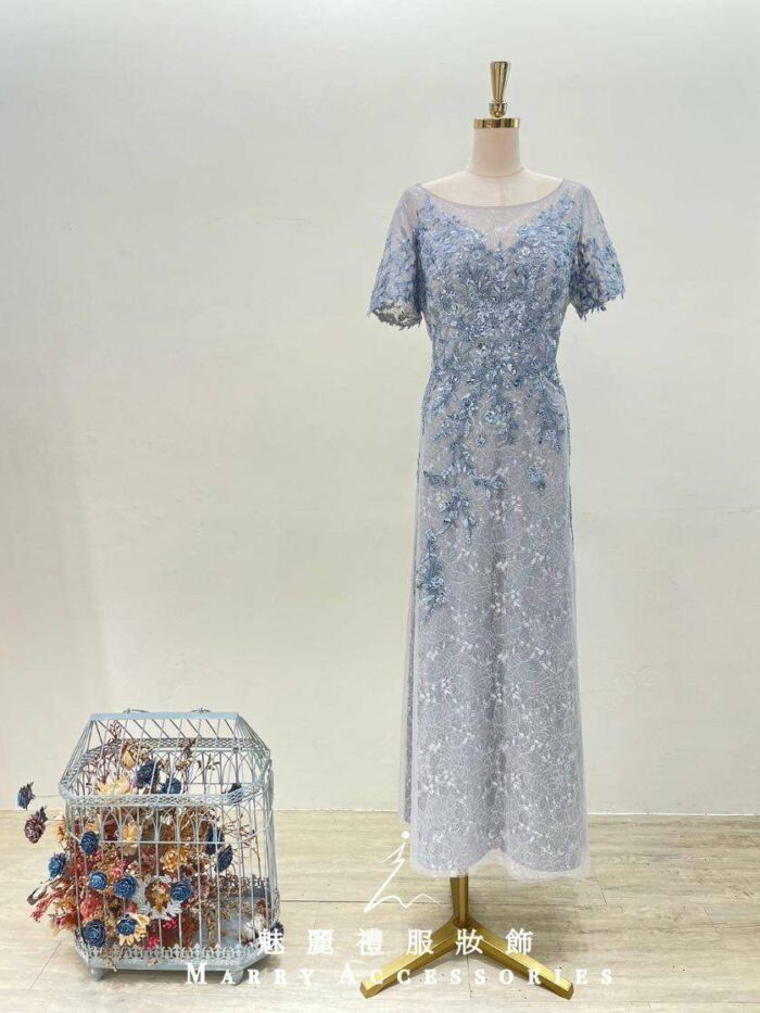 莫蘭迪藍亮片織花蕾絲裙媽媽禮服