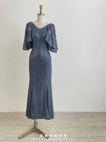 這款 藏青絲綢鑽花小外套魚尾禮服,以沉穩內斂的藏青色為主色調,採用 高級絲綢布料 製作主體,搭配設計感精緻的小外套。
