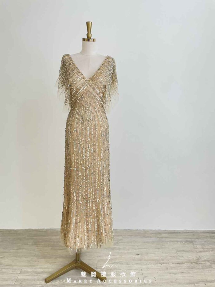 禮服表面以亮片刺繡成流線型圖騰,沿著身形自然延展,如金色水波般律動,帶來強烈的動態流感。