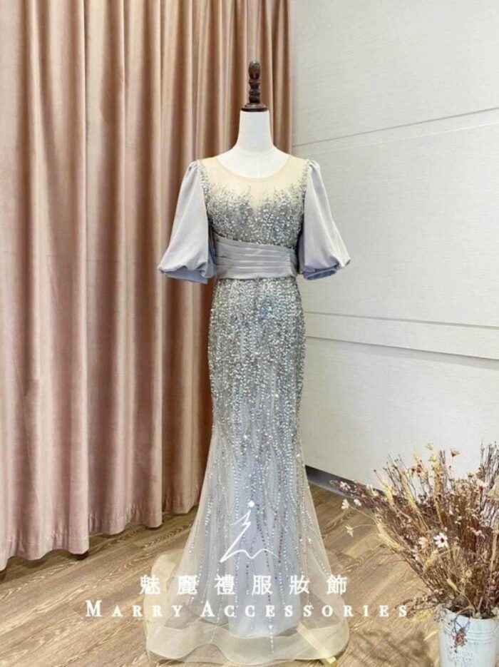 銀色泡泡袖亮片魚尾媽媽禮服