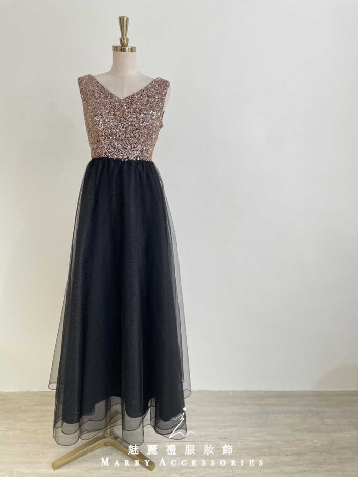 這款 香檳金亮片背心亮黑紗裙禮服,以細緻閃耀的香檳金亮片為上身主視覺,搭配層次感十足的 亮黑色紗裙,整體設計結合了奢華感與現代感。