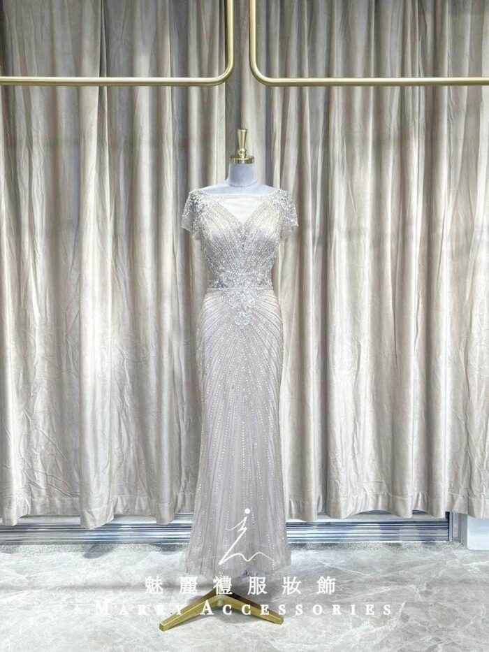 這款「香檳金胸前網紗珠工小包袖媽媽禮服」是一款優雅華貴的禮服,為媽媽們提供了參加各種正式場合的理想選擇,如晚宴、婚禮或宴會。