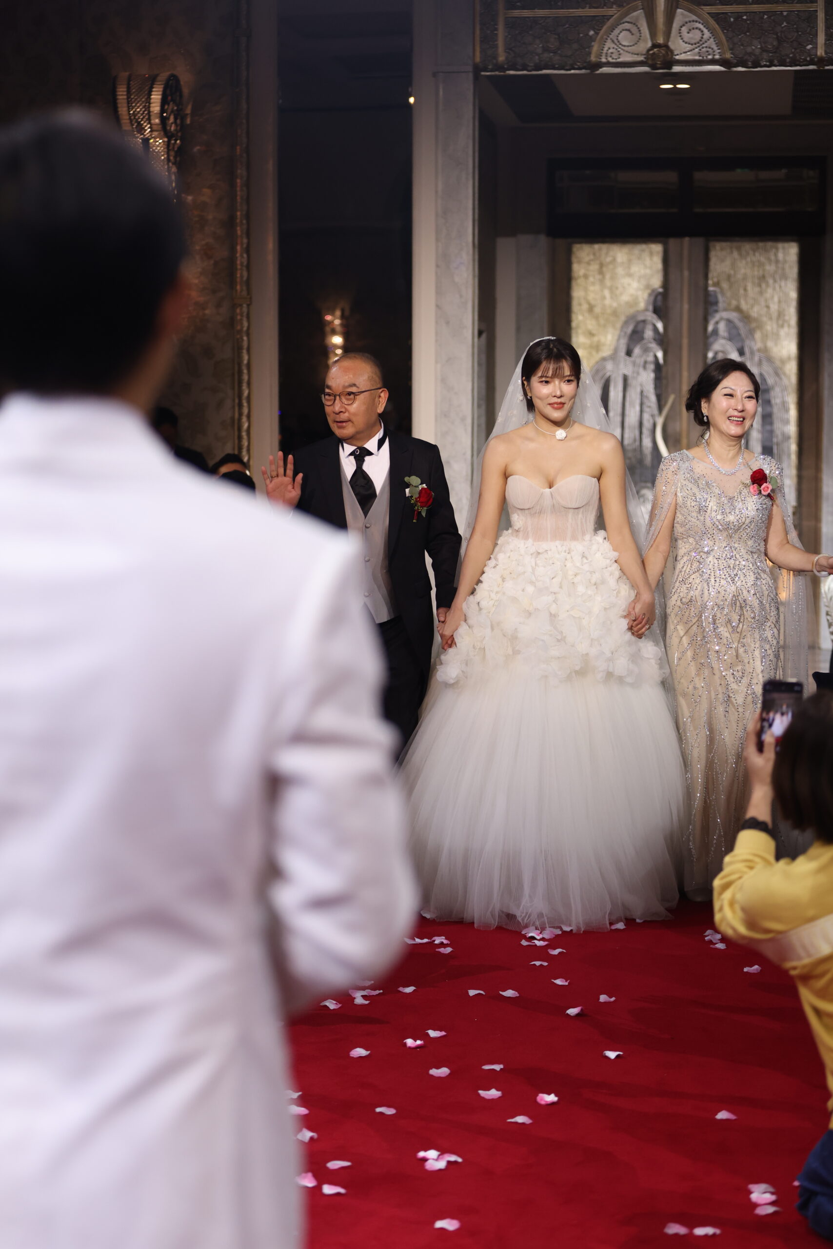 禮服下半身為典雅的 魚尾剪裁,自胸腰貼合曲線,延伸至膝下緩緩展開,銀鑽在裙擺處仍延續鋪排,展現身形的婉約與修長比例。